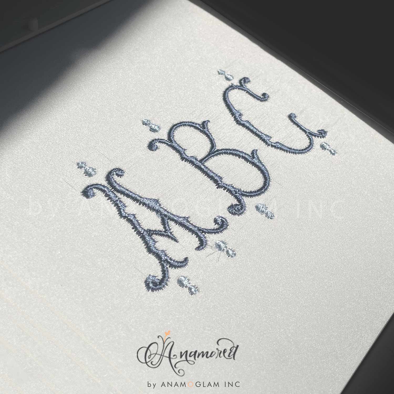 3 inch set (height) Includes 26 left, 26, center, 26 right letters Satin stitch throughout.