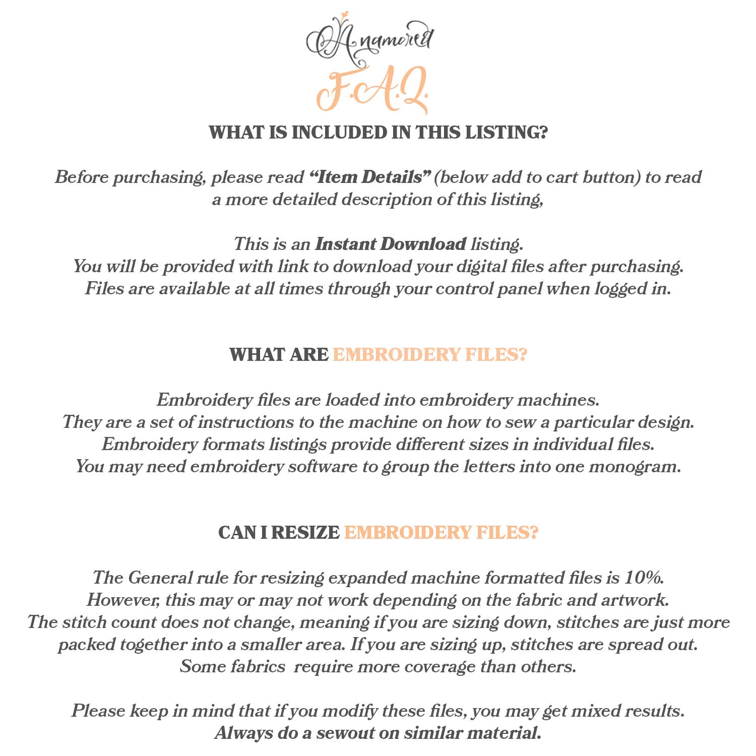 Formats Provided: {.dst} {.exp} {.hus} {.pes}, {.jef}, {.xxx}, {.emb} {.vip} {.vp3} Each letter is in it’s own file
